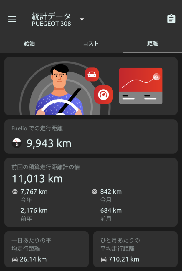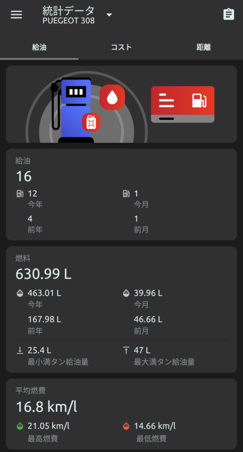 この1年の走行記録です。アプリfuelioでの給油記録になります。