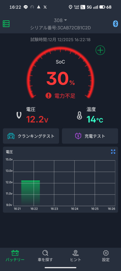 車のバッテリーの状態を監視するツール。スマホにアプリを入れブルートゥース接続で状態を確認できる。