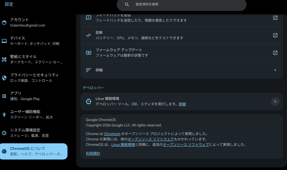 まず、Chromebookの設定でLinux開発環境がオンになっていることを確認しましょう。