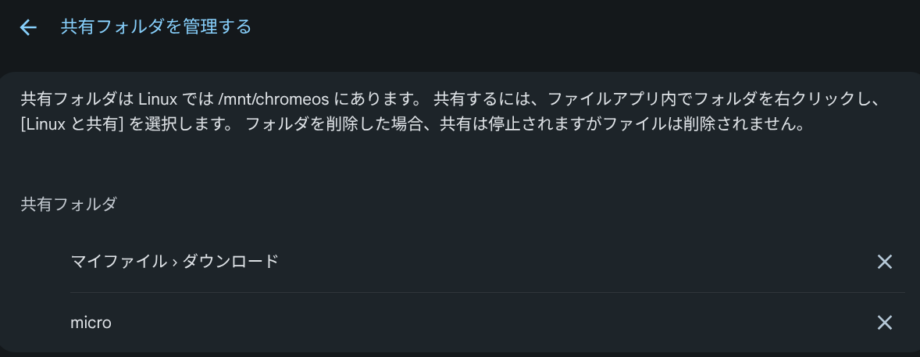 次にLinuxとの共有フォルダもあらかじめ決めておきましょう。ワタシはダウンロードフォルダとMicroSDを共有にしています。