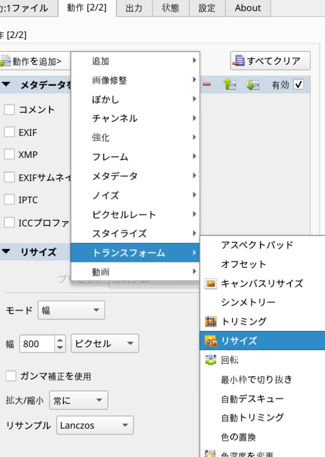 • 動作を追加からトランフォーム→リサイズを追加